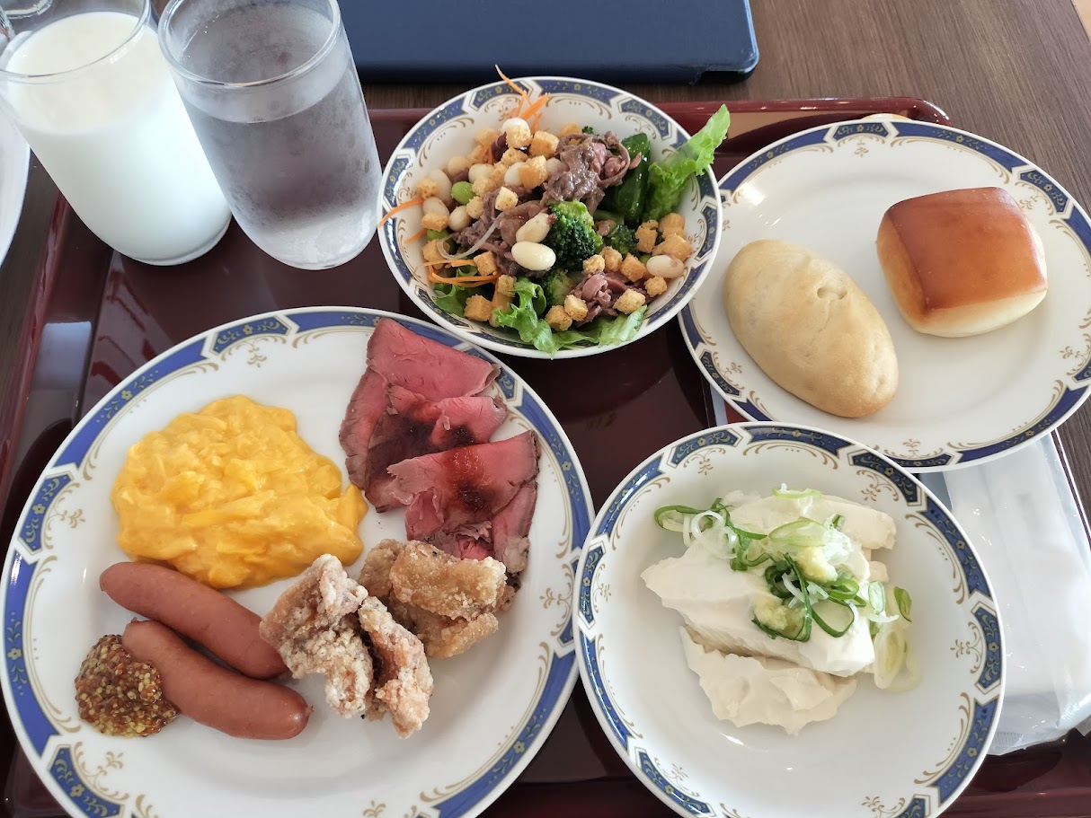 翌朝の朝食はとっても豪華なバイキング。野菜サラダやハムやローストビーフがとっても美味しい。
