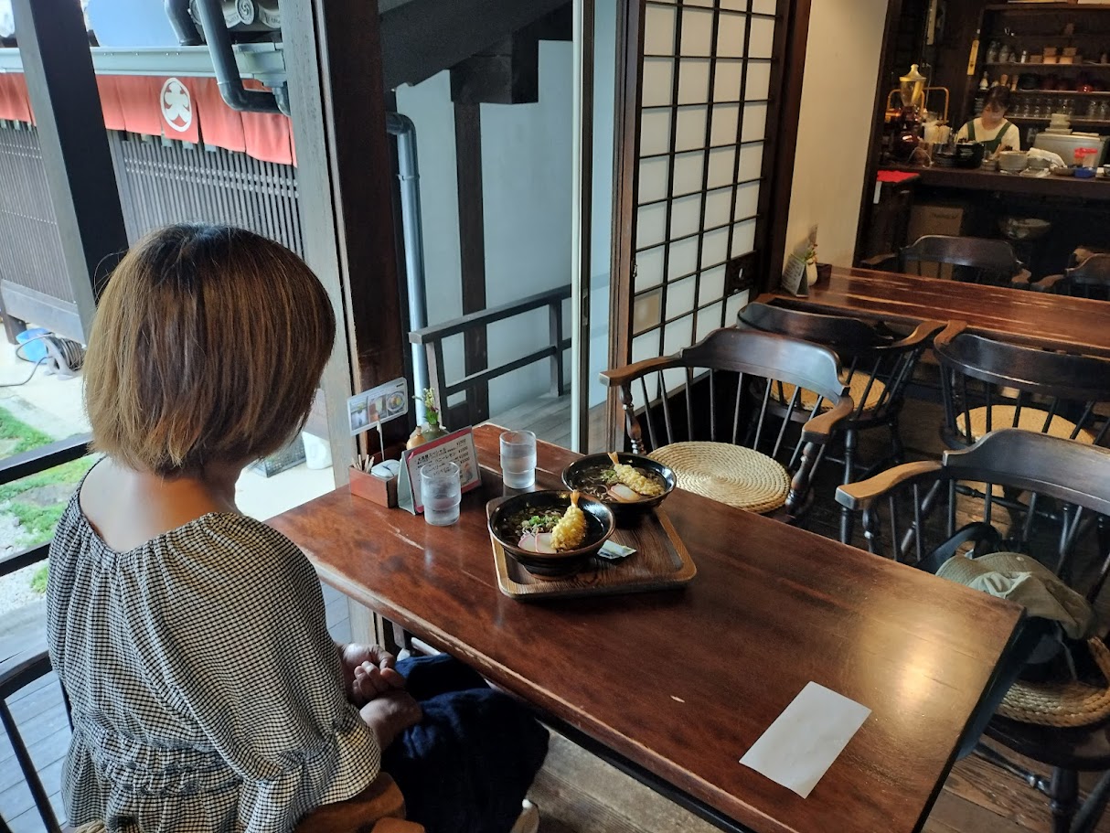 見つけたお店で天ぷらそばを頂きました。つゆが濃い目で美味しい蕎麦でした。お焼きを食べ歩きして、楽しい時間になりました。