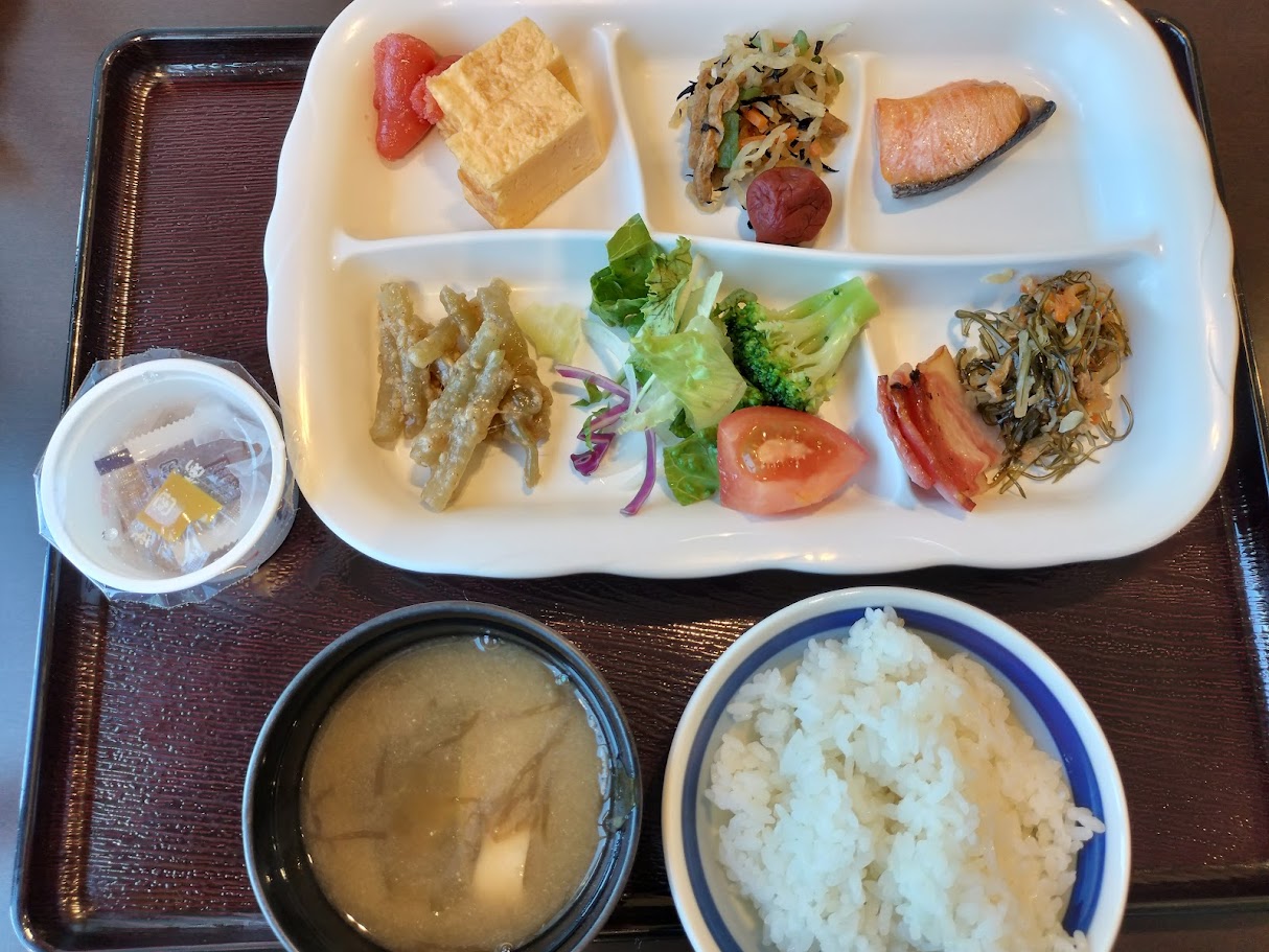 ぐっすりと寝て、翌朝も大浴場へ。日の出を眺めます。朝ごはんのバイキングはおそば、海藻類、焼き魚、玉子焼き、どれも美味しくて食べ過ぎてしまいます。