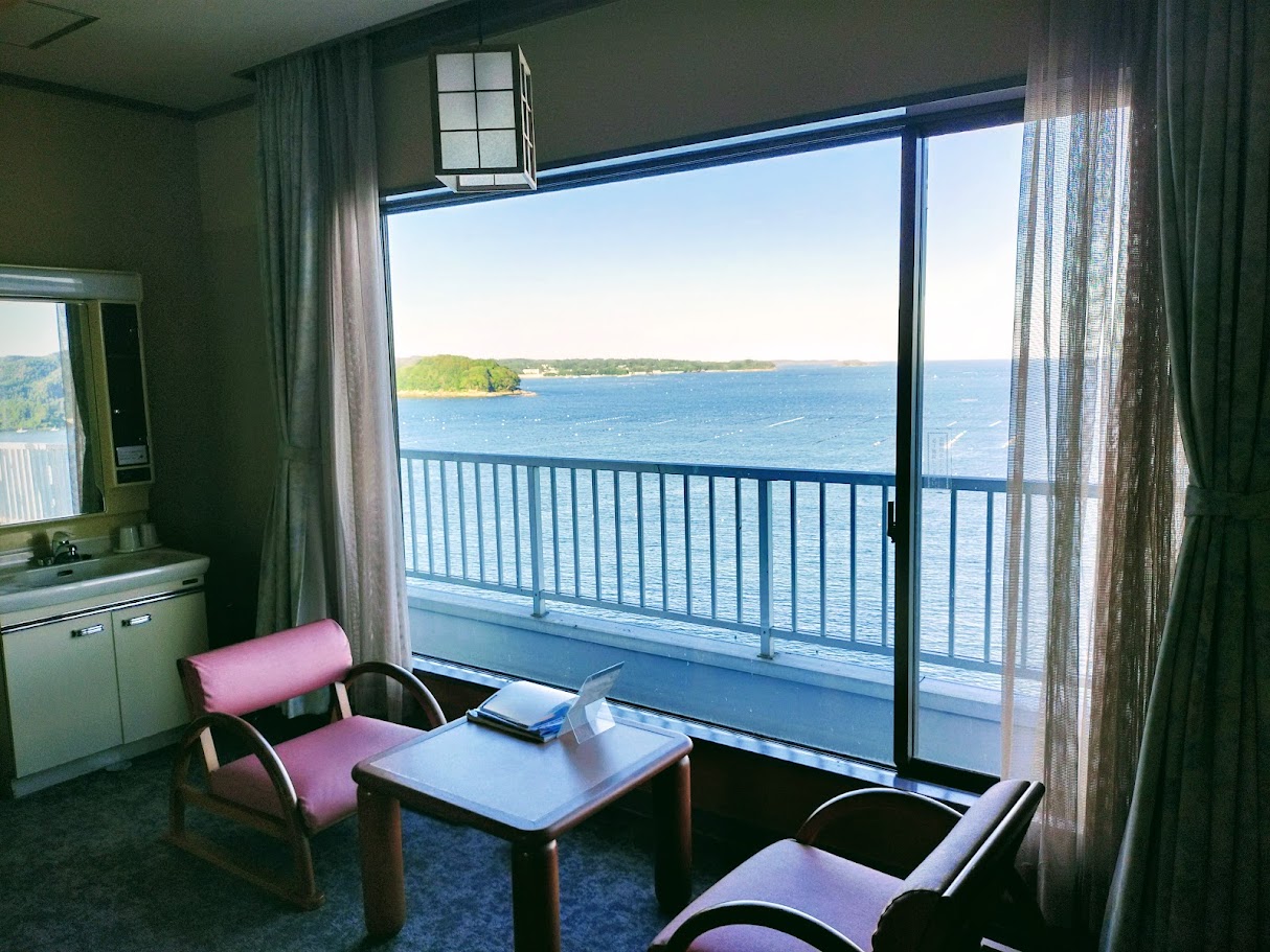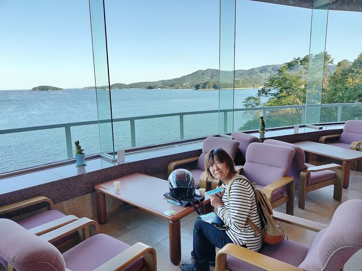 南三陸町「南三陸ホテル観洋」に到着。海が見えるロビーで、ウェルカムドリンクのりんご酢をいただきます。