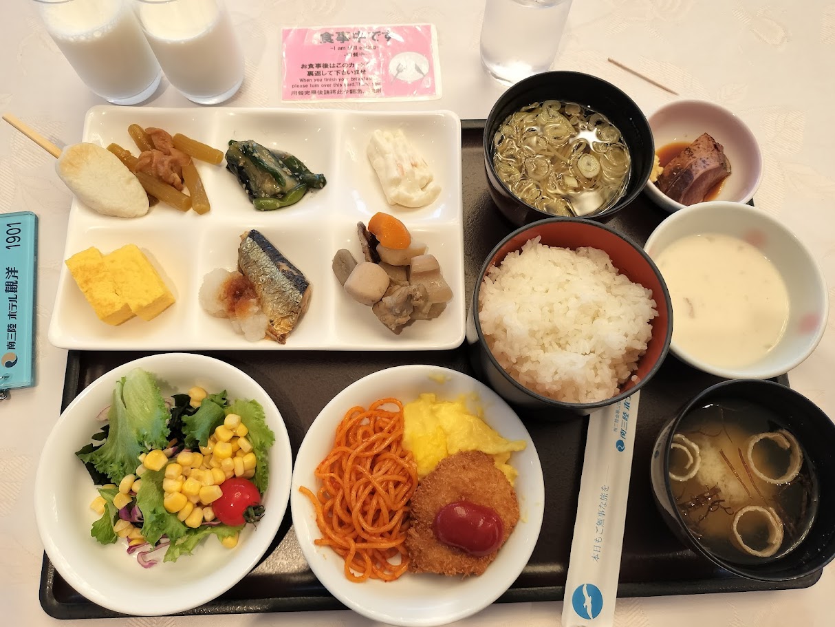 「まごころと浜料理の宿 ホテル近江屋」の朝ご飯。美味しいおかずがいっぱい。バスツアーのお客さんが多く、平日なのにけっこう混みあってます。