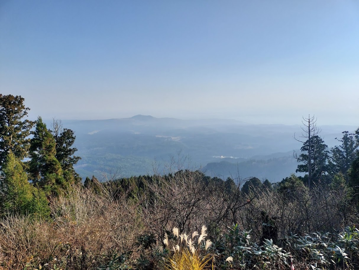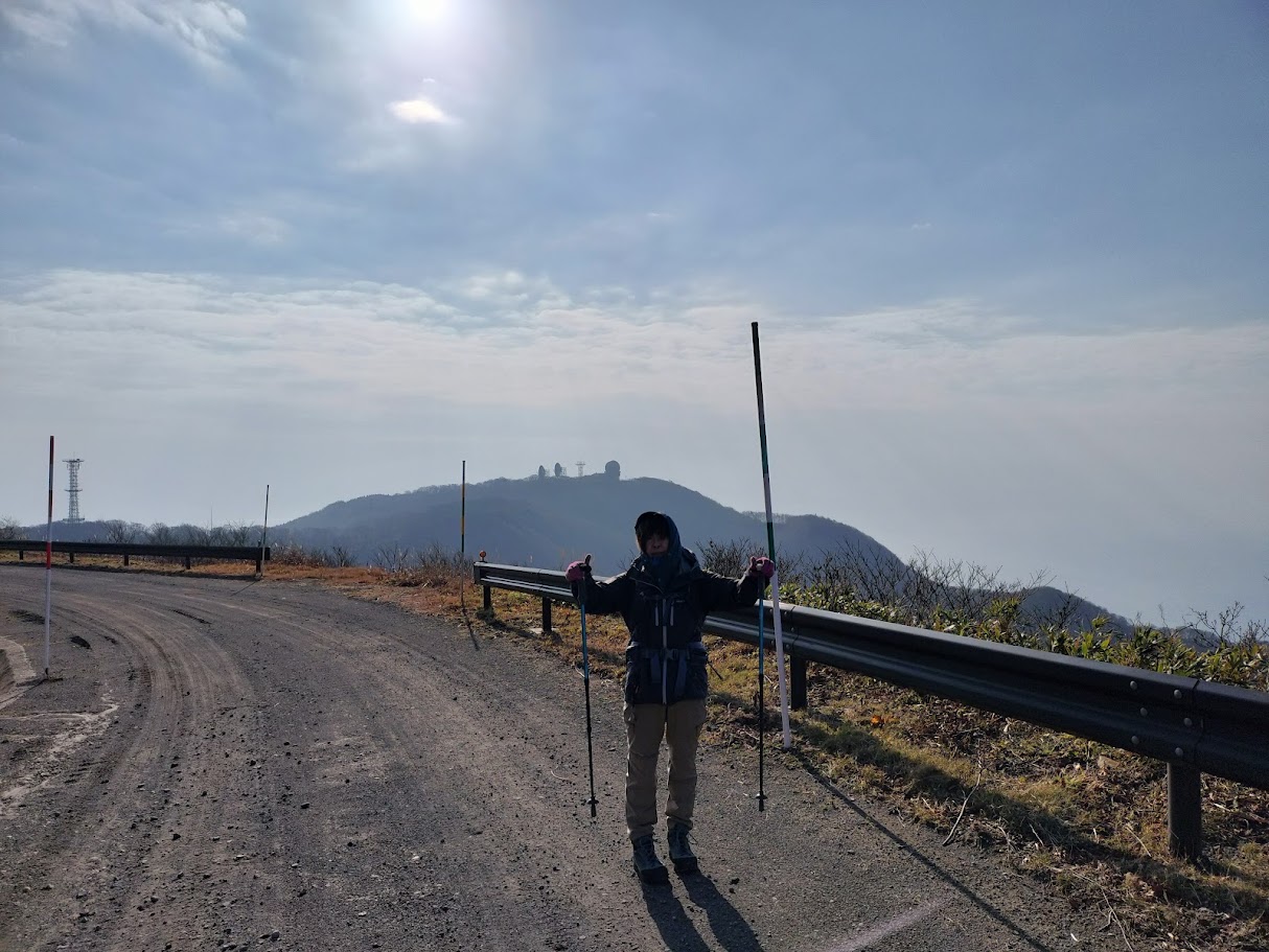 真山神社にお参りして登山開始。真山山頂へ。寒風山、大潟村を眺めますが、朝の内はガスで視界いまひとつ。