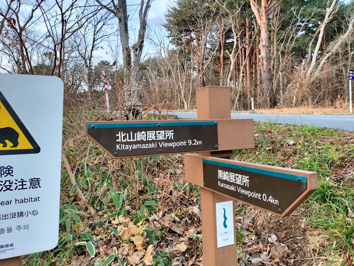 国民宿舎くろさき荘入口で下車。ここから北山崎方面に南下するコースの看板を発見。