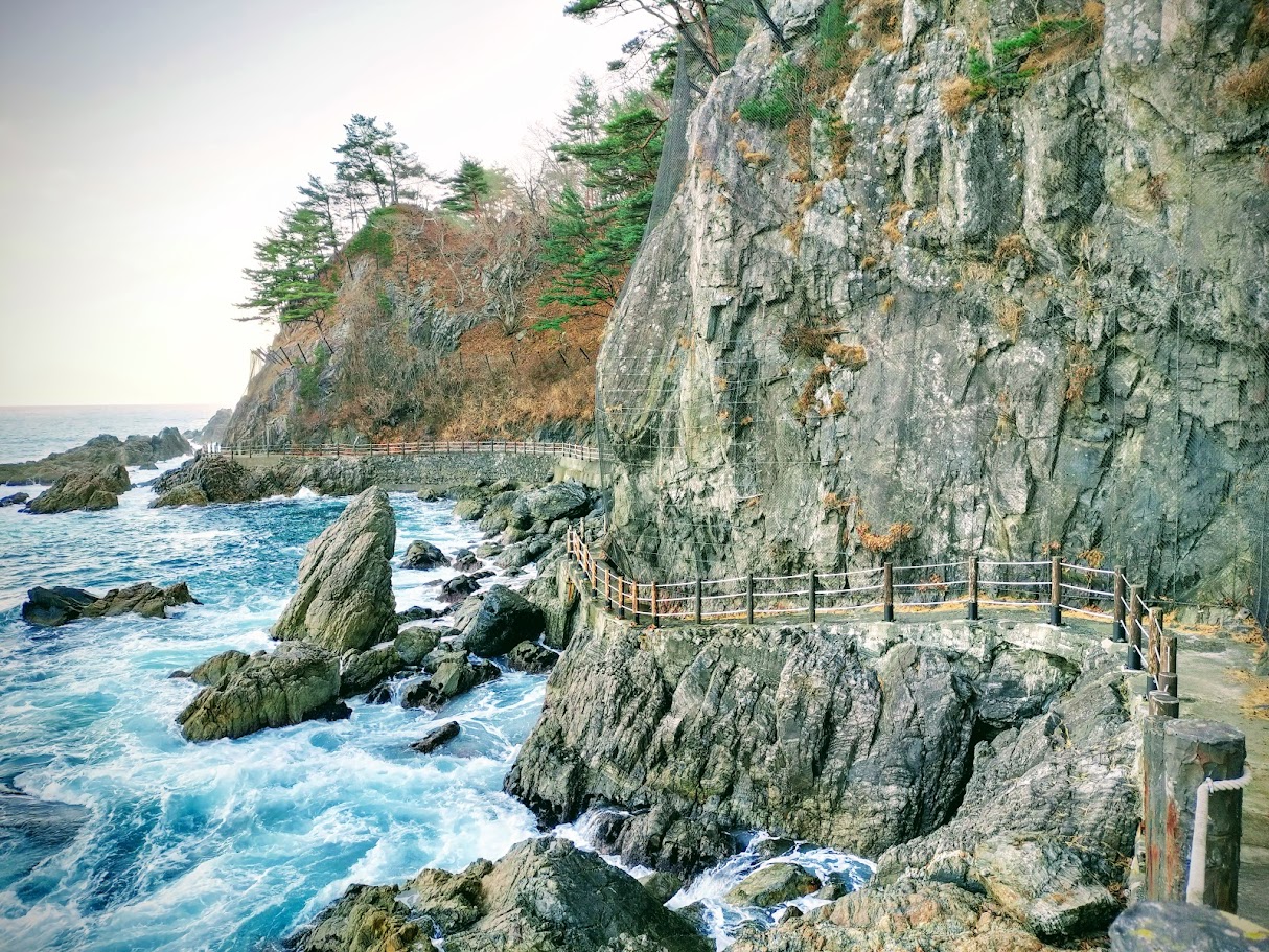 手掘りトンネルを抜けて断崖の道を通り、海スレスレの道を歩きます。大迫力!