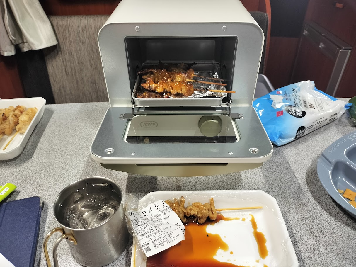 新たに車内に導入したオーブントースター「Toffyオーブントースターミニ K-HTS1 食パン1枚分」を使ってみます。500Wなのでポータブル電源で余裕で使用可能。焼き鳥やパンをアツアツで味わえます。